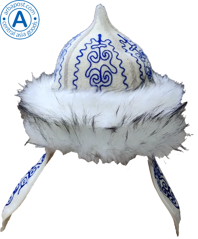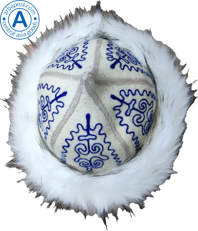 Altyn Adam cap made of felt and fur, white with blue pattern