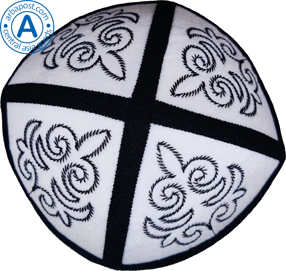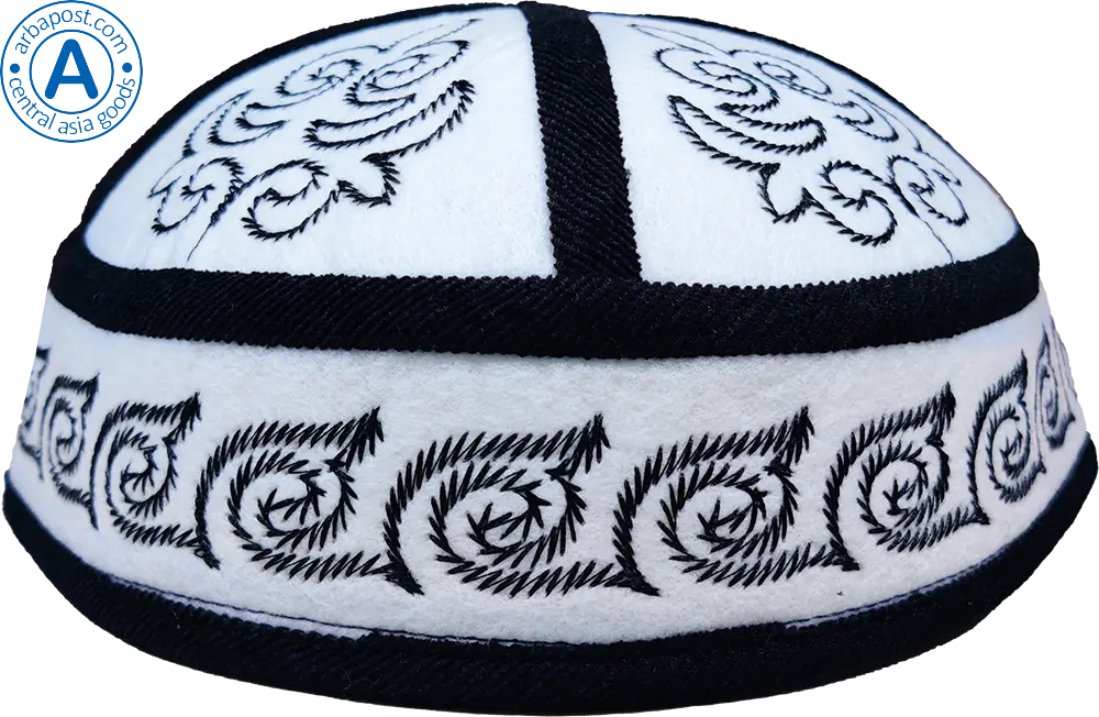 Altyn Adam cap made of velours, short, white with dark blue zhapyrak pattern