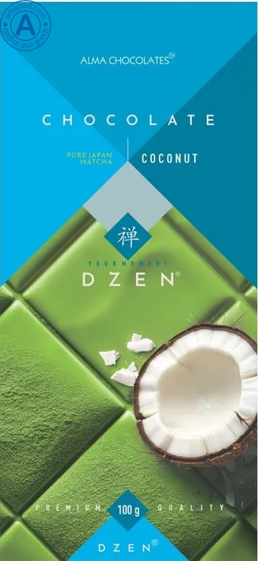 This is Kazakhstan premium white chocolate bar with matcha tea and coconut.