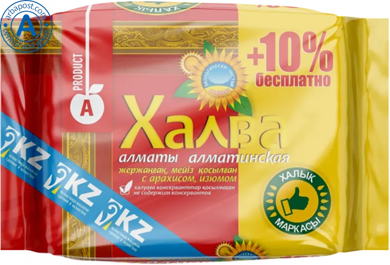 It’s Kazakhstan sunflower halva with peanuts and raisins, produced from natural components on high-quality equipment in accordance with international standards and our traditions