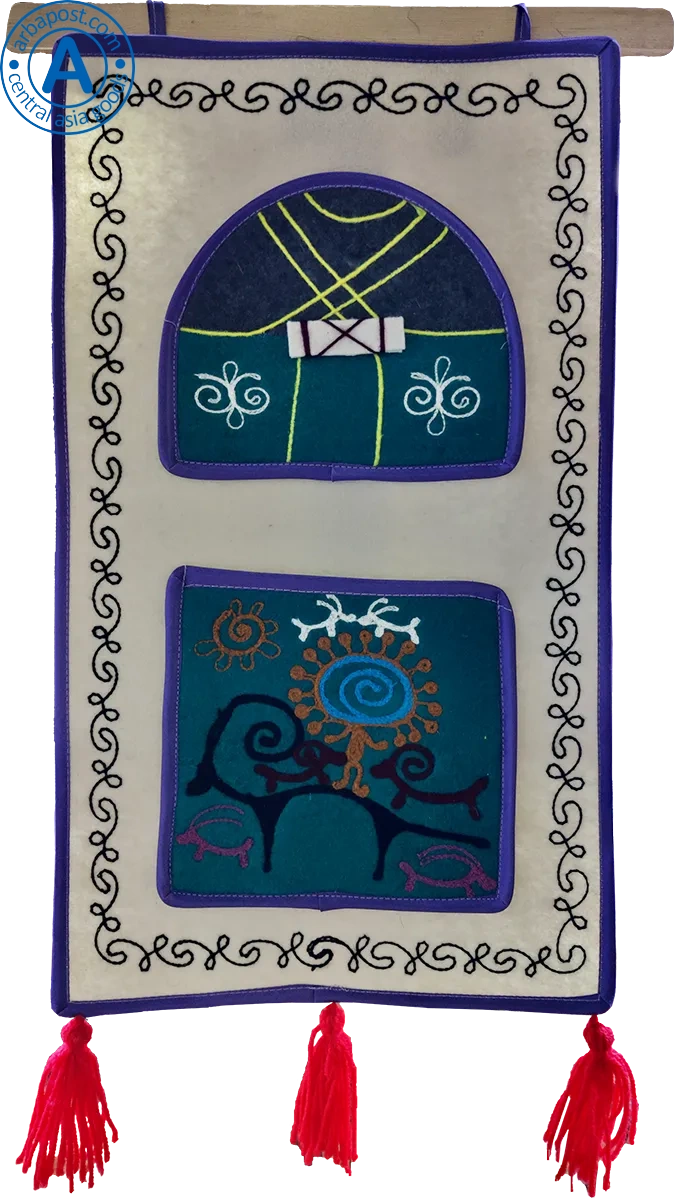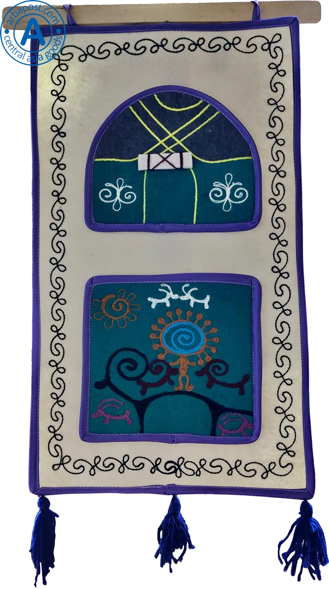 Altyn Adam picture made of felt, triple, blue yurt-orange man on blue background