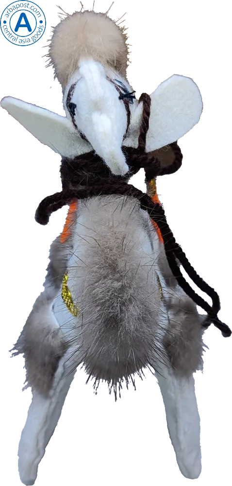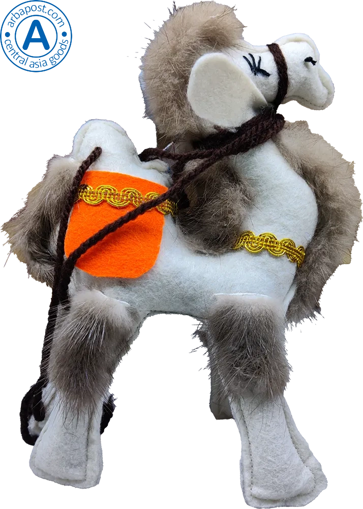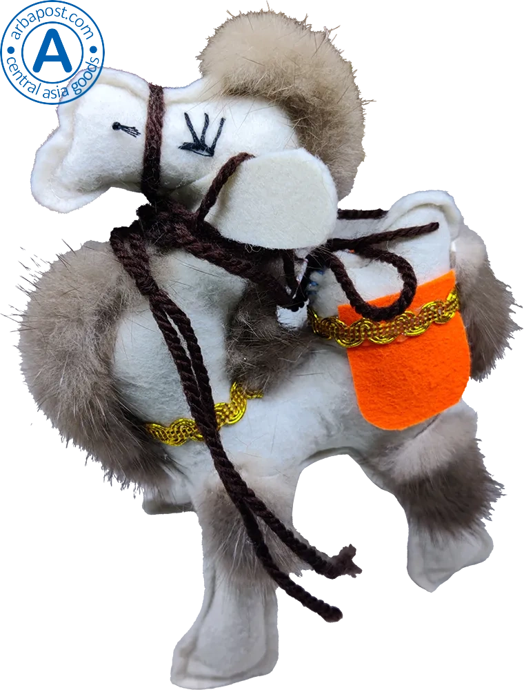 Zhibek Zholy camel made of felt, white-brown with orange bag