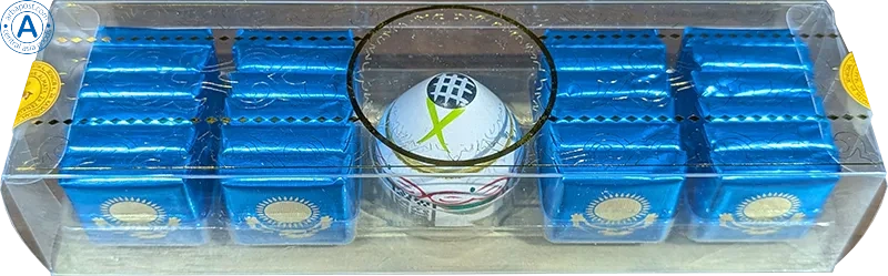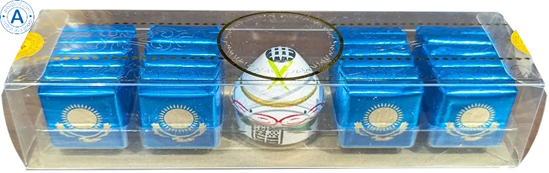 The package has 24 pieces of chocolate mini bars and yurt figure as memory souvenir about Kazakhstan.