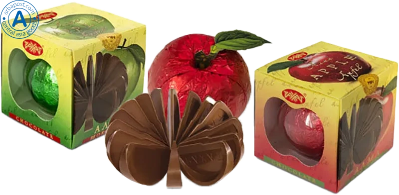 This is Kazakhstan figured cast dark chocolate in the shape of an apple, folded from individual thin slices. Each chocolate apple is wrapped in colored foil and packed in a colorful cardboard box with windows.