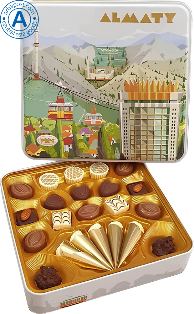 This chocolate candy is sold in tin packaging and consists of the following types of Kazakhstan candies: