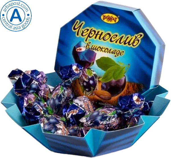 This chocolate set is made from prunes coated with Kazakh chocolate glaze and whole Californian almond kernels.